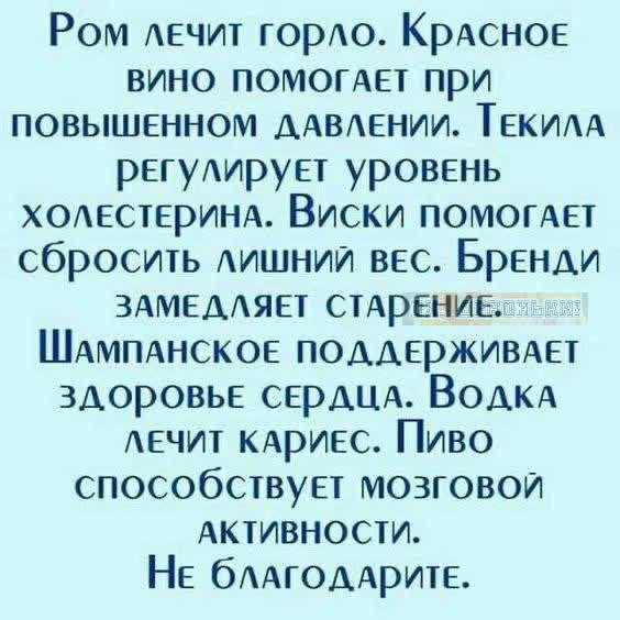 - Итак… 20-30 граммов: помогут унять мигрень и стенокардию, головную боль, успокоят разгулявшийся нервишки… снимут стресс…